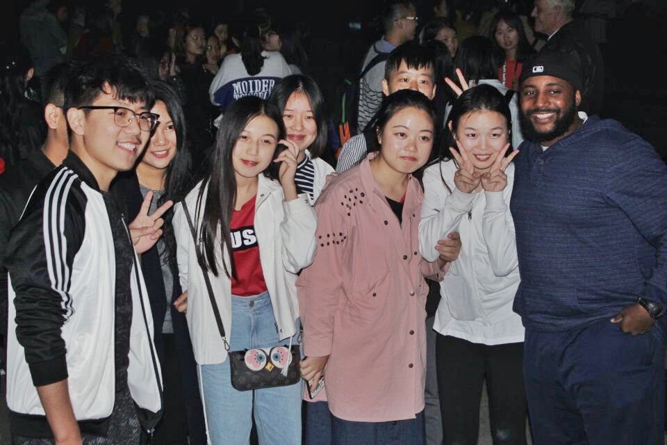 过了把瘾之后,现场观众就各自五五分组,进行组内交流互动,外教Tom、Allen和一位美女外教老师与各小组进行互动,每个人都积极参与到活动中,用英文谈论自己喜欢的音乐类型、歌手、讲讲关于自己有趣经历或是说个笑话,有的小组甚至唱起了英文歌。现场气氛活跃,似乎吹过的风都笑的直不起腰了,直往身上扑。