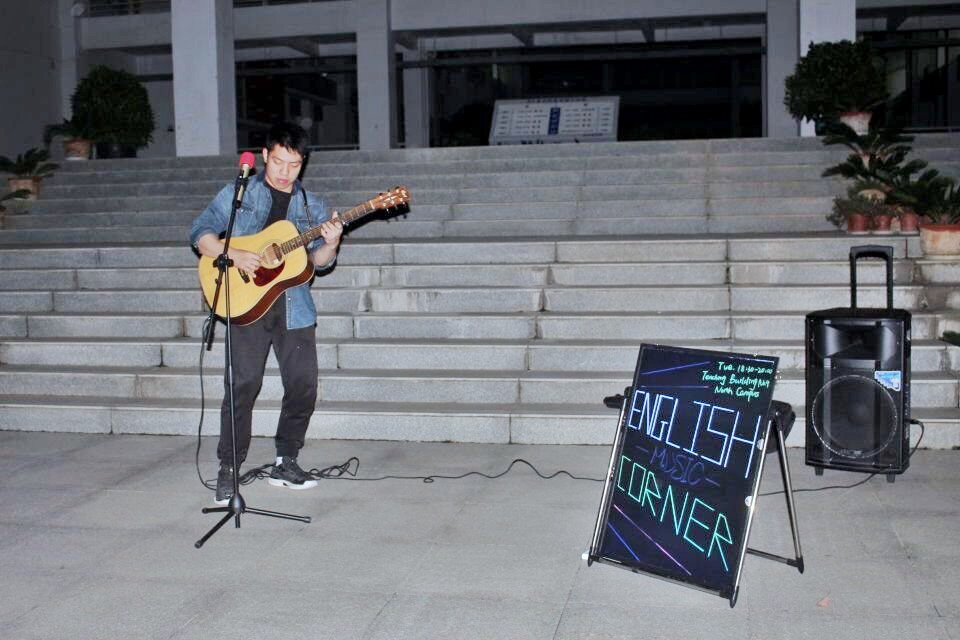 英语角不仅是第二课堂,也是拓展能力的一个平台,它不仅让同学们有练习口语的机会,同时也培养了人际交流的能力。英语角在美丽的校园中进行,可以让学生们亲近自然,开阔心胸和视野,让思维更活跃和开放。启动仪式刚结束,大家就兴致勃勃地开始了英语角的第一次会话活动。英语歌唱比赛冠军得主带来了两首经典英文歌曲《Five Hundred Miles》 《Shapeof You》,动听的歌声配着悠扬的吉他声,这似乎就是一场小型的演唱会,现场观众皆沉浸其中。曲毕,赢得了热烈喝彩。想必这位小哥哥已经收获了不少小迷妹了吧。
