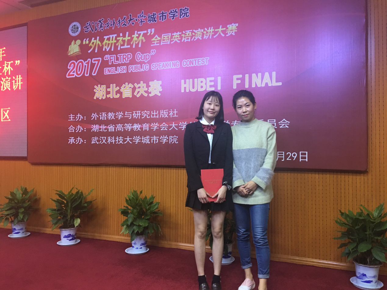 10月29日上午,2017年“外研社杯”全国英语演讲比赛湖北赛区决赛,在武汉科技大学城市学院成功举办,我院15级商务英语1班徐赵君同学喜获湖北省二等奖,翻译专业教研室叶莹老师获优秀指导教师称号。
