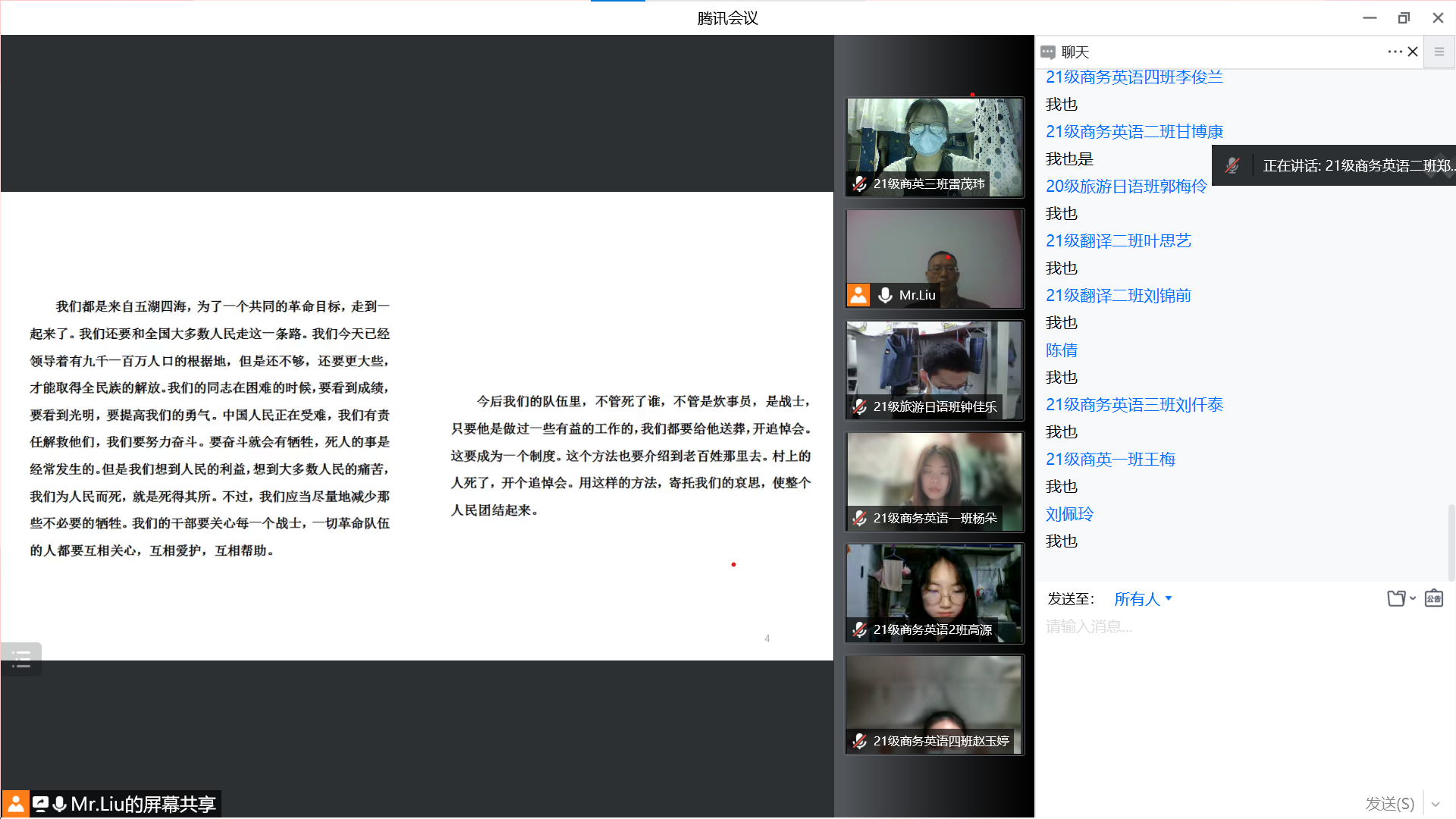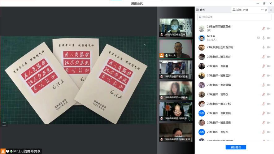 “本次线上思政课使我对自己的思想导向有了更清晰的认知,共产党员深‘其身正,不令而行;其身不正,虽令不从’的道理,身体力行地实践着为人民服务,因此才能获得人民的信任,被人民坚定选择,缔造了伟大的新中国。”活动结束后21级商务英语三班的唐旋斌同学感触颇多。