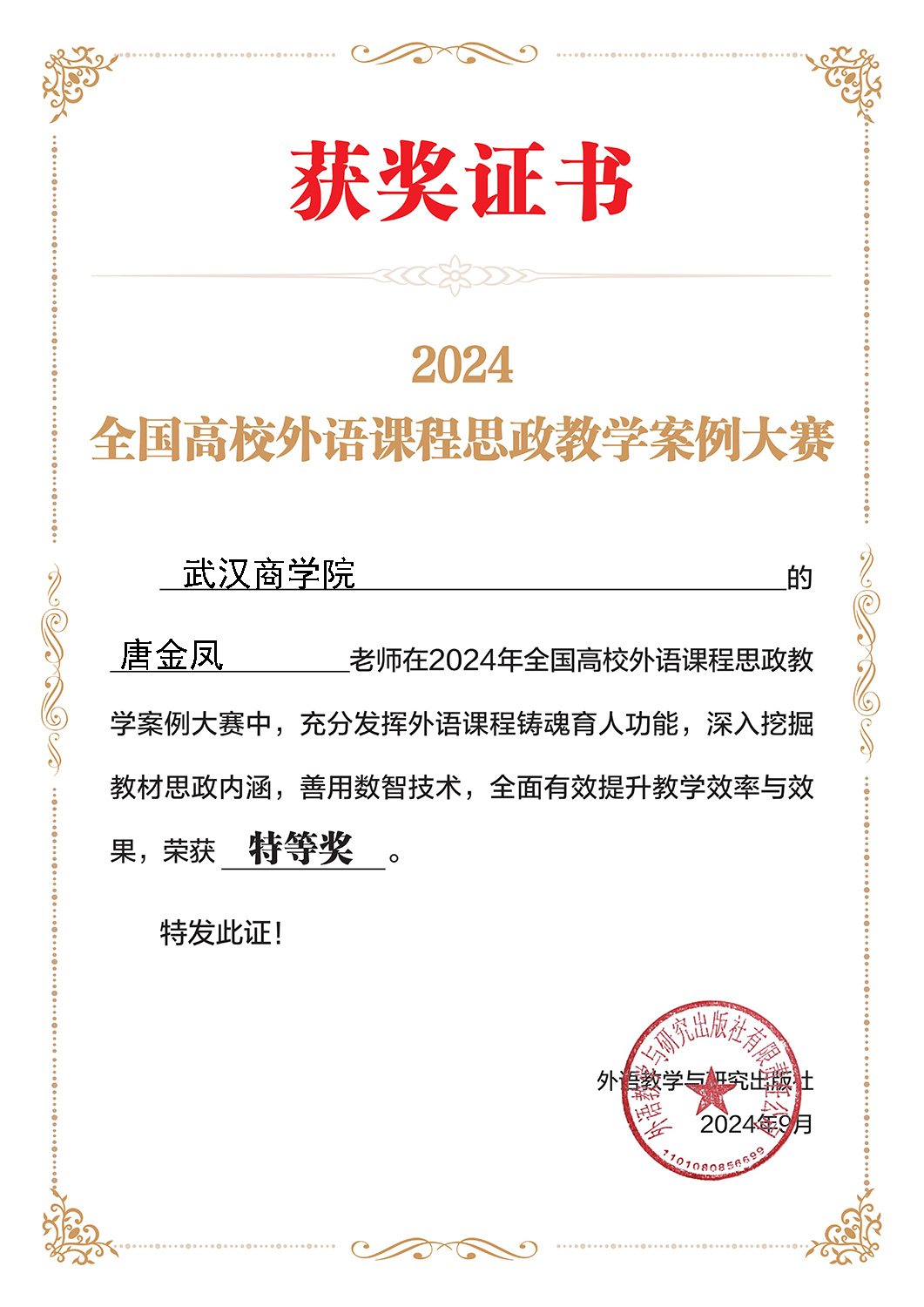 图1 唐金凤老师2024年全国高校外语课程思政教学案例大赛特等奖证书