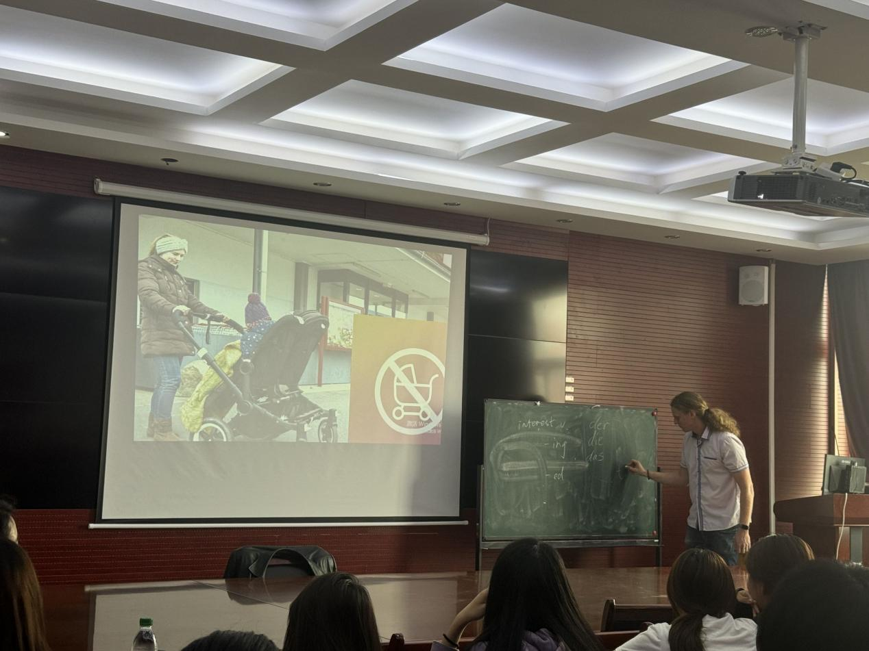 讲座采用德英中三语演讲模式,前半场由老师介绍引入德国文化,内容涉及社会、饮食等多方面内容,带领现场学生走入和了解德国文化。后半场则以问答互动形式展开,学生们就自身感兴趣的德国文化内容积极提问,在交流中主动探索德国文化,深入领略其独特魅力,讲座最后以课内内容问答的方式收尾。讲座形式出心裁,老师通过播放视频的方式展示了德国人的日常生活。同时,老师巧妙借助问答环节,针对学生提出的“中德教育,中德工作的不同之处”进行详细解答,进一步补充德国社会文化内容,例如德国注重孩子的自由生长,会留更多的课余时间让孩子去发展兴趣爱好,而中国更注重孩子的学业巩固与提升,会减少课余时间,将重点放在课堂上。24级旅游日语专业郑静怡表示,此次讲座为她打开了一扇了解德国文化的大门,使其领略到别样的世界风情,在多元文化交融中收获了独特的体验与感悟。