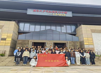 在革命先辈雕像前,全体党员及入党积极分子面向党旗庄严宣誓,重温入党誓词。活动尾声,党员们及入党积极分子合影留念。2023级商务英语专业韩秋芬感慨道:“这些红色展品,是革命精神与时代青年的共鸣纽带。参观过程中,我认识到,革命文物承载的先辈信念、红色史料记载的奋斗岁月、老物件反应的初心坚守,共同绘就‘传承红色基因、激扬青春担当’的精神图景。”